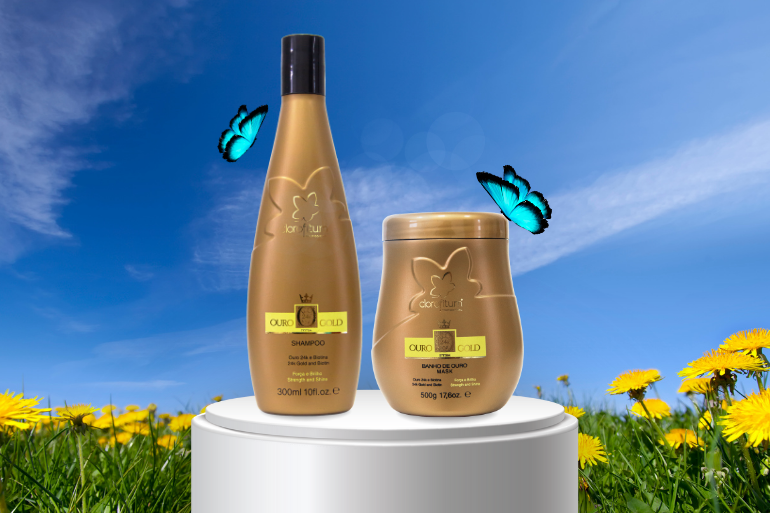 Uma ótima pedida é o Shampoo Ouro 24k e a Máscara Ouro 24k, que devolvem maciez e elasticidade, deixando os fios com toque sedoso e aquele brilho intenso que a gente ama!
